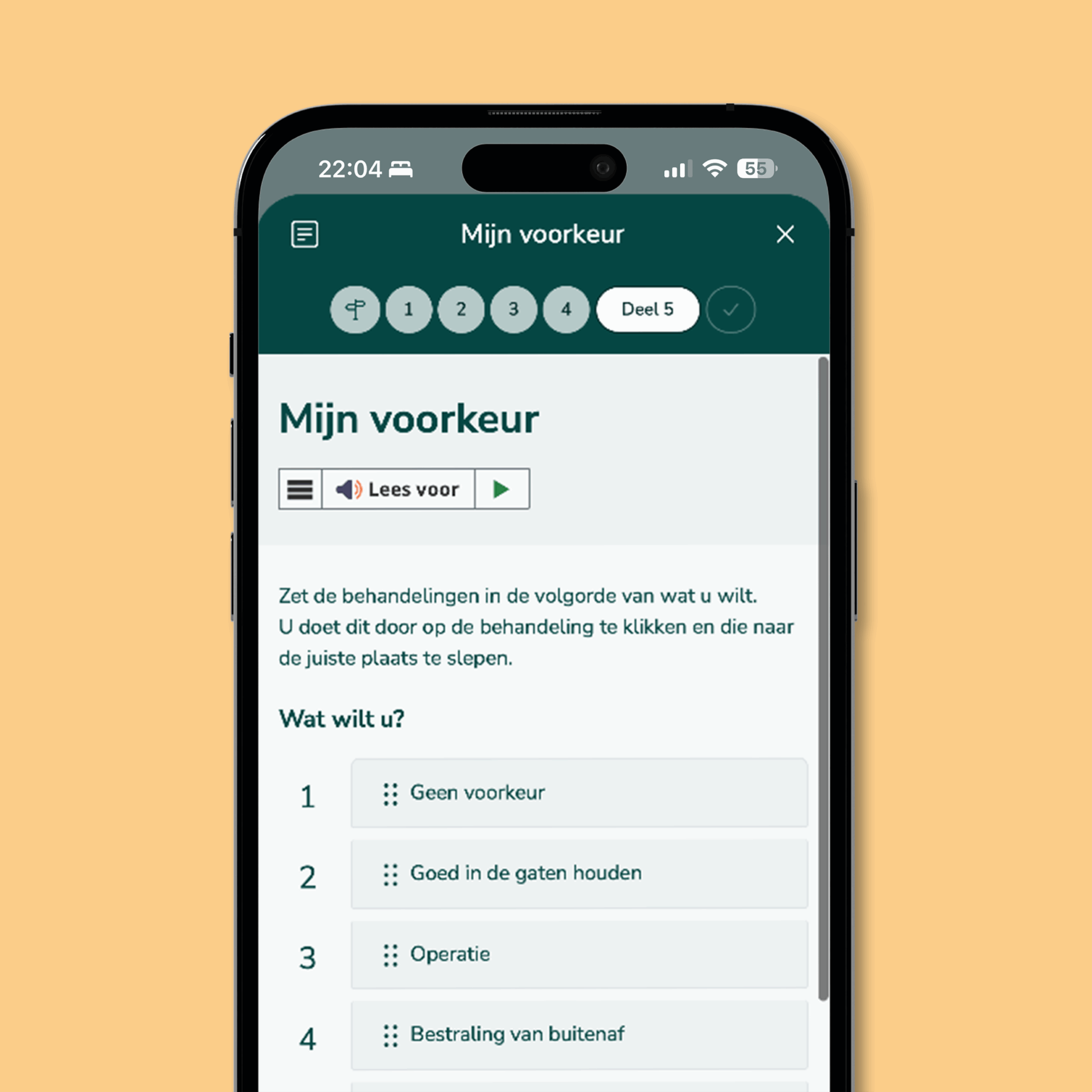 Door deze twee te scheiden, kunnen we elke stap optimaal ondersteunen: eerst het zelfinzicht en de gespreksvoorbereiding, daarna het maken van een weloverwogen behandelkeuze. Dat houdt het proces overzichtelijk, persoonlijk en effectief voor zowel patiënt als zorgverlener.